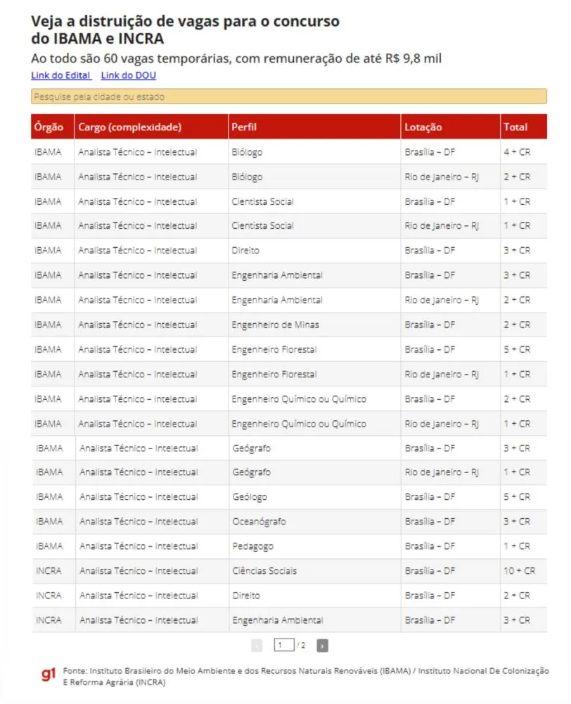 Do total de oportunidades, 40 são destinadas ao Ibama, para o cargo de Analista Técnico de Complexidade Intelectual, incluindo cadastro de reserva. Já o Incra oferta 20 vagas para os cargos de Analista Técnico de Complexidade Intelectual e Analista Técnico de Complexidade Gerencial, também com formação de cadastro reserva.