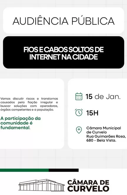 A Câmara Municipal de Curvelo realiza, no próximo dia 15 de janeiro, às 15h, uma Audiência Pública para discutir os riscos à segurança e os transtornos provocados por fios e cabos de internet soltos, baixos ou sem qualquer utilização espalhados pela cidade. O encontro acontece no plenário da Casa Legislativa, na Rua Guimarães Rosa, nº 680, bairro Bela Vista.