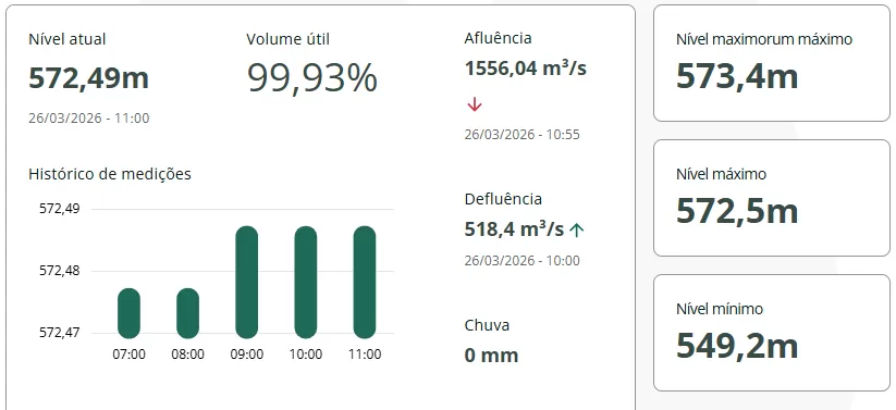 De acordo com os dados mais recentes, registrados pelo www.cemig.com.br nesta quinta-feira (26/03/2026), às 11h, o nível da barragem está em 572,49 metros, com volume útil de 99,93%, indicando operação dentro da normalidade.