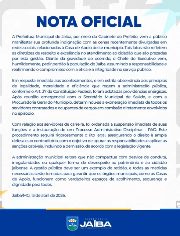 Em nota oficial divulgada na segunda-feira (13), o município afirmou ter recebido as imagens com “profunda indignação”, ressaltou que a conduta não condiz com os princípios da administração pública e pediu desculpas à população.