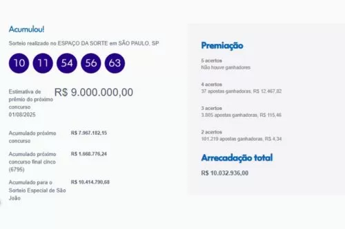 Os números sorteados foram 10, 11, 54, 56 e 63. A aposta foi feita na LOTERMINAS.