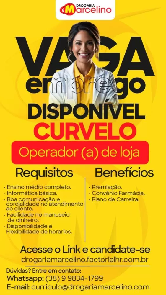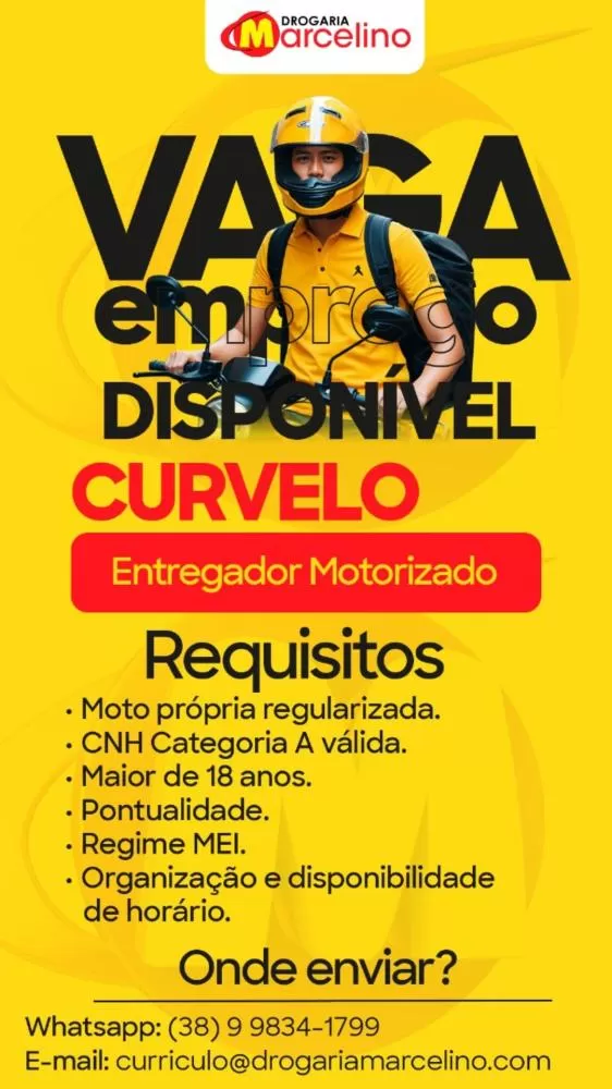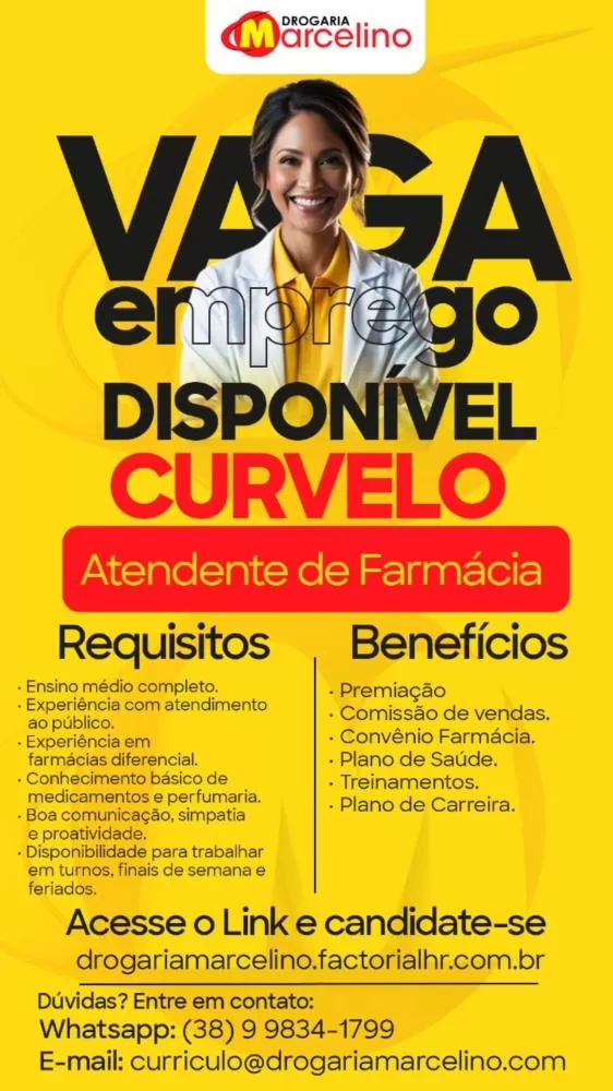 A Drogaria Marcelino, em Curvelo, está com vagas abertas para Atendente de Farmácia, Entregador Motorizado e Operador(a) de Loja.